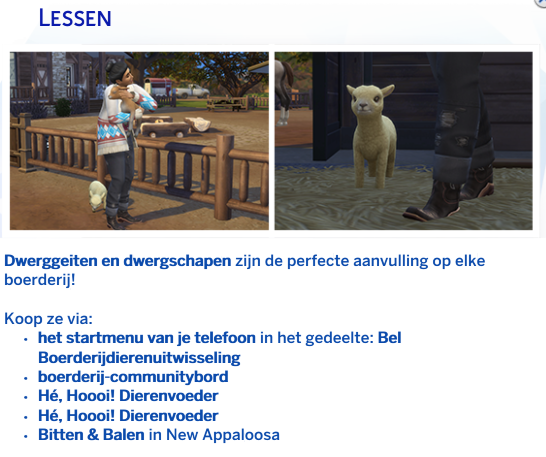 Na het scheren van een dwergschaap vind je informatie hierover terug in het Werkboek. Helaas heeft EA de tekst niet aangepast en is vergeten om dwergschapen hieraan toe te voegen, dus wordt er alleen aangegeven dat je wol kan maken door het scheren van een Llama (Landelijk leven).