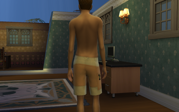 Zoals de kop al zegt, mijn sim man houdt een broek aan onder de douche. Het is een broek uit de laatste nieuwe uitbreiding. Ik heb geen enkele download onder mijn spel, het gaat om deze broek.