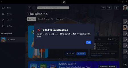 Hi hsock Please read the first post in this thread 'Failed to Launch Game: An Error on Our End' for Multiple Games. Any Fixes? | EA Forums - 12494514 for information on this error.