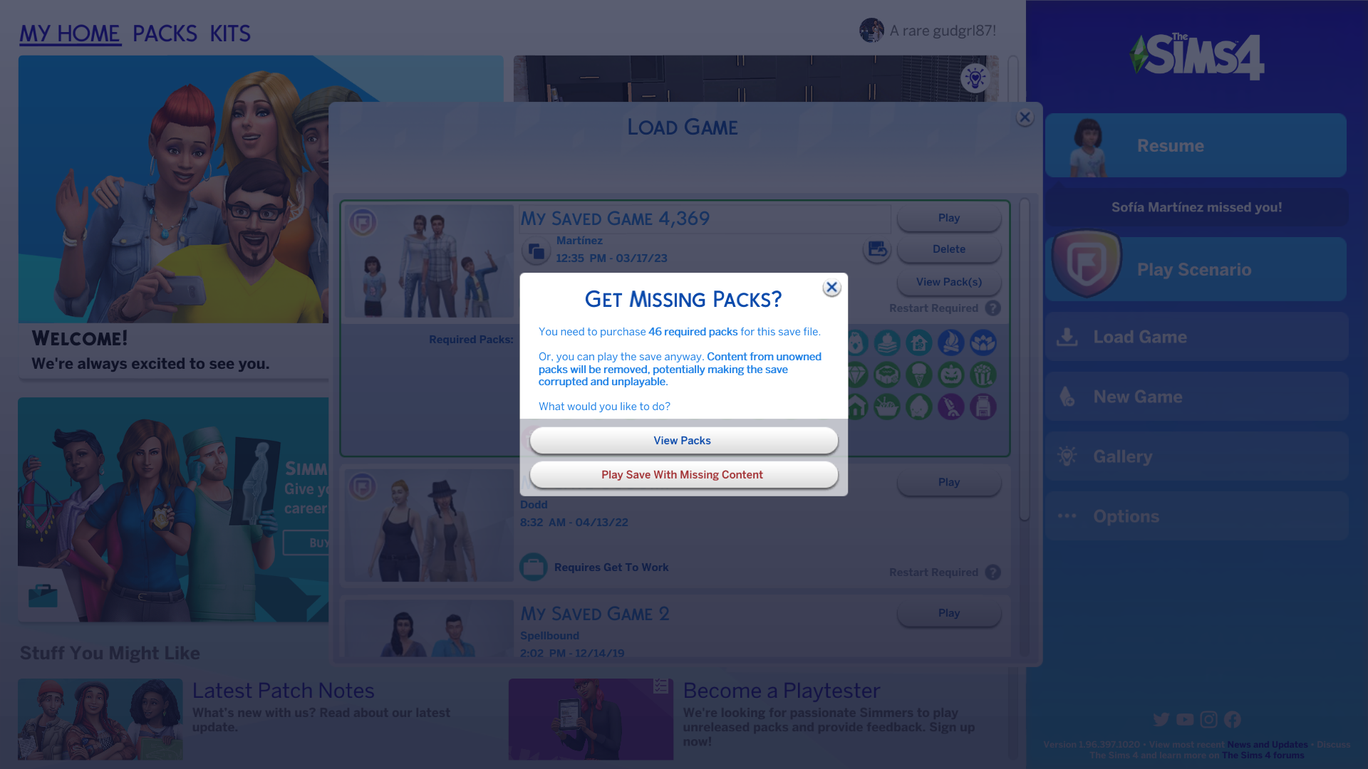 Once your packs are loading properly, you can restore your saves, Tray files, mods and custom content, and screenshots (if you want to keep them) from the Sims 4 user folder you renamed before uninstalling the game. Move these files to the corresponding new folders within Documents > Electronic Arts > The Sims 4, and you'll be able to pick up where you left off.