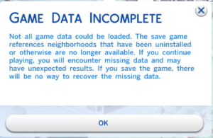 Game Data Incomplete Not all game data could be loaded. The save game references neighborhoods that have been uninstalled or othe...