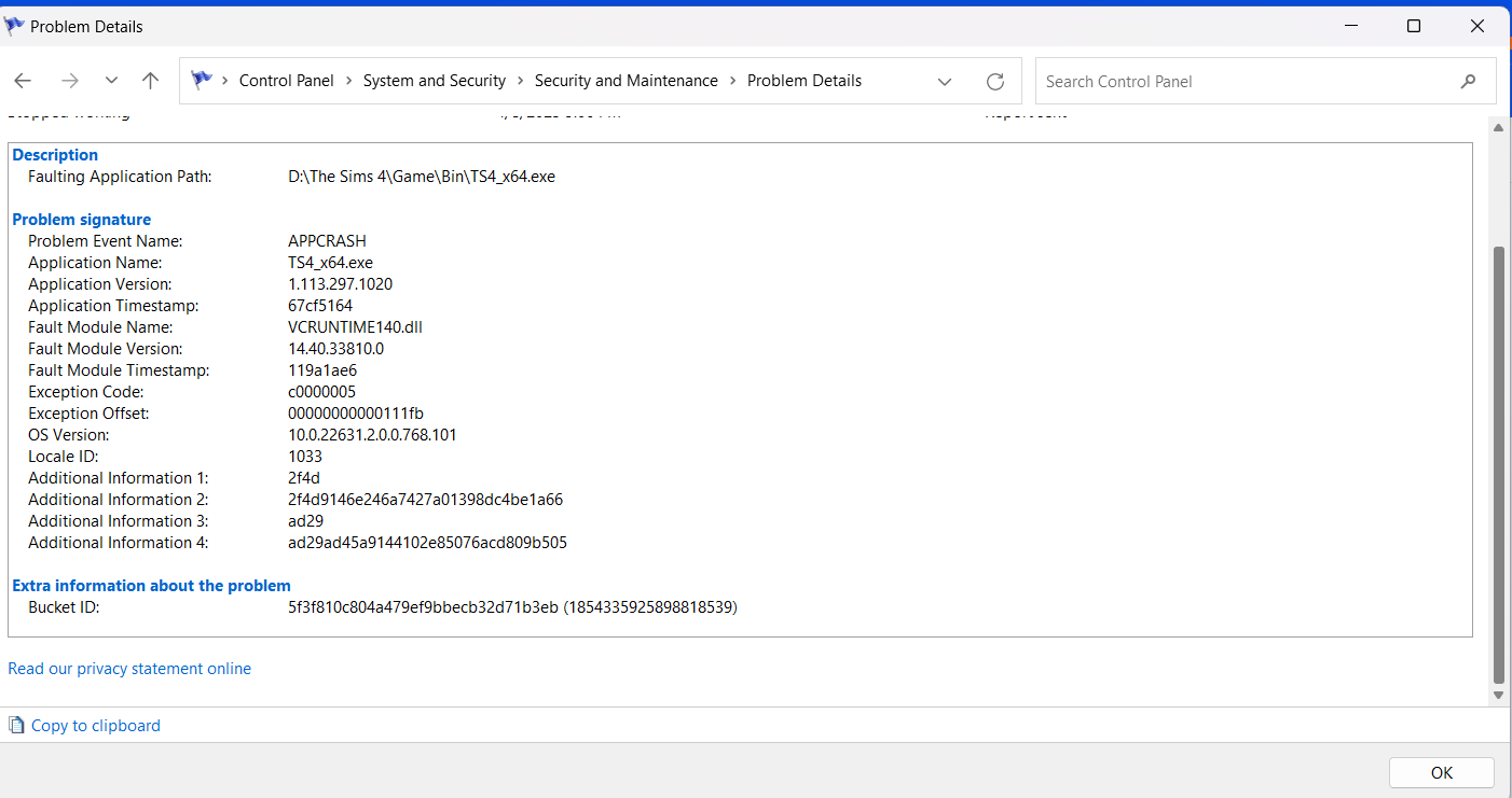 SmallRussianAvo This error points to an issue with the 2015-2022 VC++ runtimes, which Sims 4 uses. But the problem could be mods or custom content rather than the runtimes themselves. Did you remove all mods and all custom content? If not, please try that now.