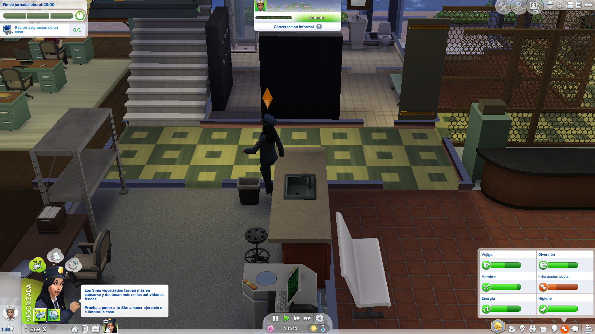 Energy bar full, Sim still asleep, after pause, she wakes up.