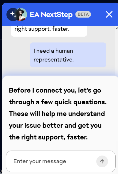 Please try using the Contact Us button at the bottom of this page. The NextStep chatbot should appear again and ask for some basic information before redirecting you to a new page that'll have the live chat option. If the chatbot still doesn't ask anything, please try using a different browser or incognito/private mode.
