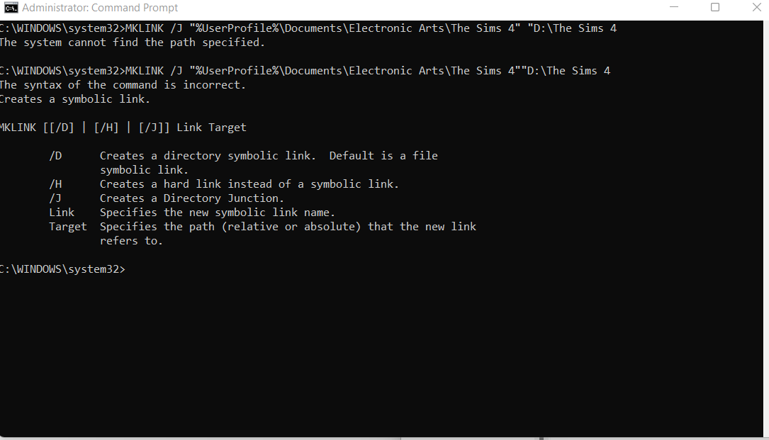 @ohjosiek The first time you tried the command, you left off the quotation mark at the end of the second file path. The second time, you still left off that last quote mark and you also didn't leave a space between the two file paths. This is the command you want to use, assuming that D:\The Sims 4 is the correct location: