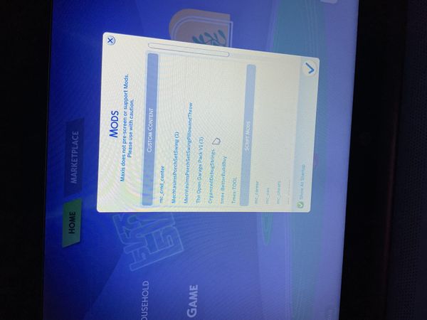 So, if you use mods or cc, you know that when you first startup the game, it gives you a pop-up of the mods and cc in your game. When I hit the arrow to close that pop-up, instead of it going away and me being on the home screen, the home screen is in the background of a translucent dark color, and I am unable to click on anything. This is a picture of how it looks when I am stuck: