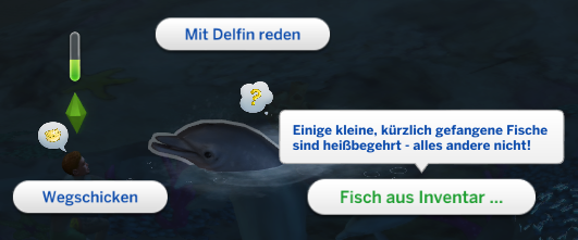 I have also made pictures of overwriting the feeding option if fish is in the sim inventory. First there is only the option, to feed by sim inventory, just after the dolphin is called. After one or two mouse clicks further on the dolphin, the options for the dolphins are changing.  I have never seen this behavior on the dolphins options, if there ist no feedable fish in the sim inventory. Feeding with fish for 2 $ never creates dissappearing dolphins. Since Sims 4 Island Life, there are some issues with Sim Inventory. Maybe it all depends.