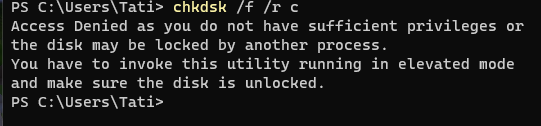- Inside the window that appears, copy and paste "chkdsk /f /r c:" without quotes, and enter