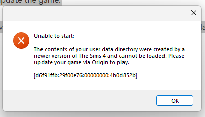 After updating this evening, I get a message that the user directory data was created by a newer version of Sims 4 and so I should update the game.