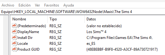 Ve al nodo [HKEY_LOCAL_MACHINE\SOFTWARE\WOW6432Node\Maxis\The Sims 4]
