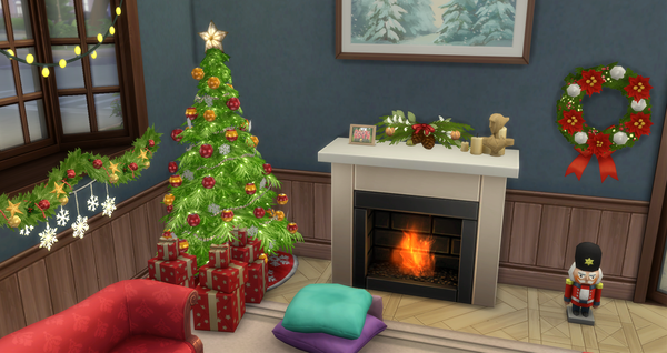 A happy Sims cartoon character points to the 6 quests displayed in bubbles. Each quest features different items such as wreaths and holiday clothing.