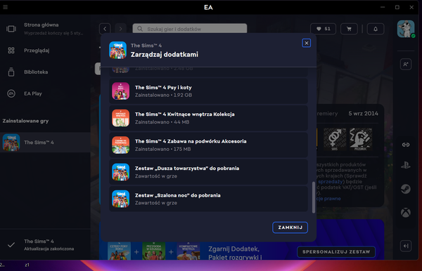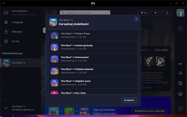Na start wyczyść kilkukrotnie pamięć podręczną EA app oraz napraw grę. W przypadku dalszych problemów, zrób kopię swoich zapisów a następnie przeinstaluj całą kolekcję TS 4 od nowa.