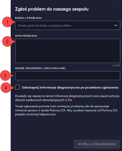 3) Możecie podać numer zgłoszenia, w przypadku, kiedy wcześniej w tej sprawie kontaktowaliście się z Centrum Pomocy EA.