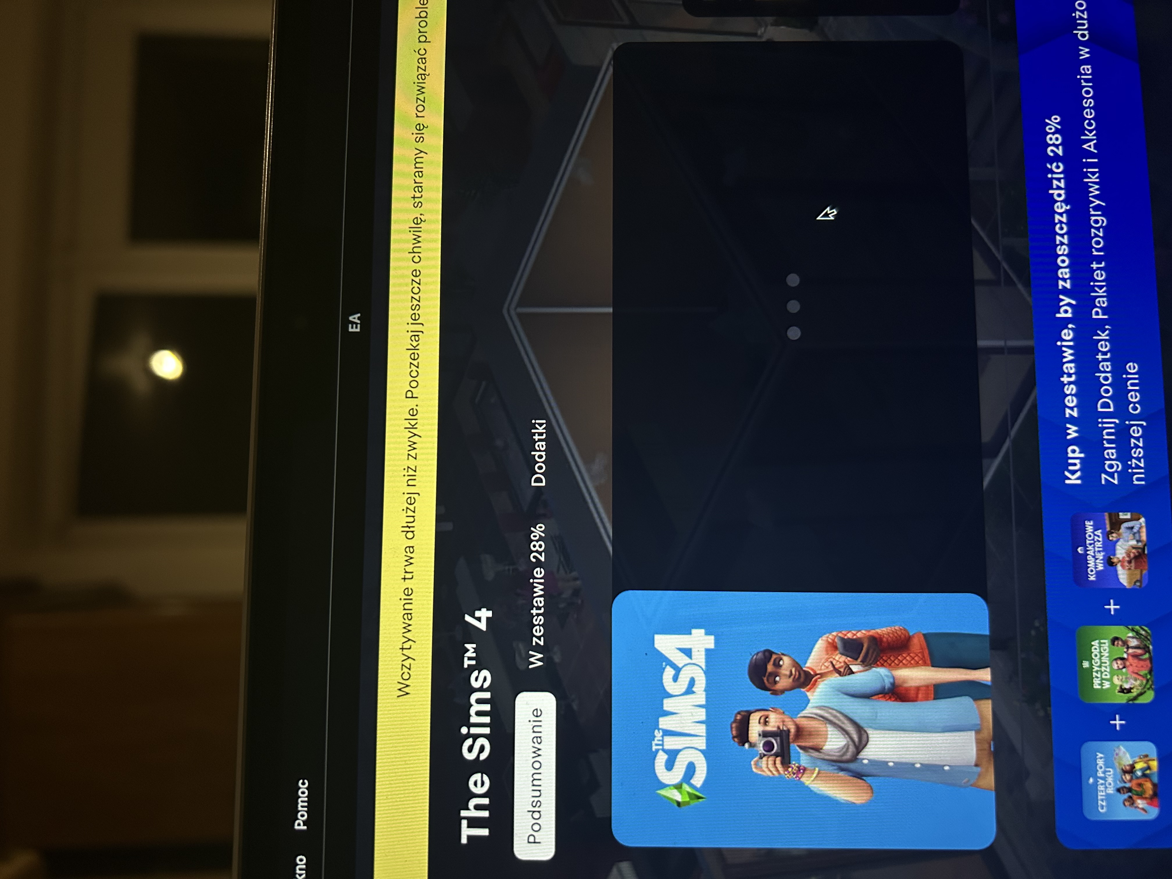 Hejka, wczoraj próbowałam włączyć simsy, przy ikonie gry na EA cały czas “kręcą się” trzy kroki, jakby ładowanie, po chwili na górze ekranu wyskakuje komunikat na żółto - wczytywanie trwa dłużej niż zwykle. Poczekaj jeszcze chwilę, staramy się rozwiązać problem.