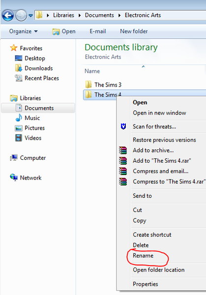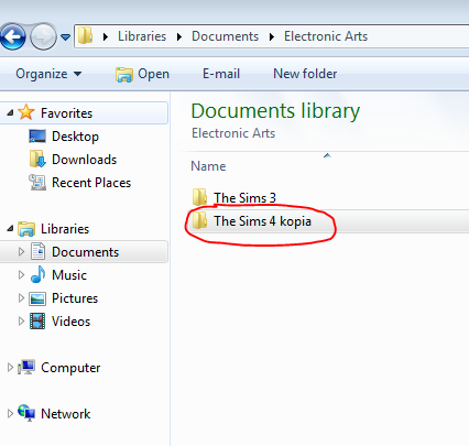 W folderze/bibliotece Dokumenty (%USERPROFILE%\Dokumenty\Electronic Arts lub %USERPROFILE%\Moje dokumenty\Electronic Arts ) > zmień nazwę folderu The Sims 4 na np. The Sims 4 kopia,