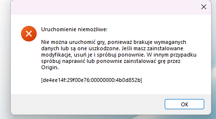 Dzięki za screen. Ten komunikat oznacza, że gra nie widzi kompletu wymaganych plików – nawet jeśli mody zostały już usunięte.