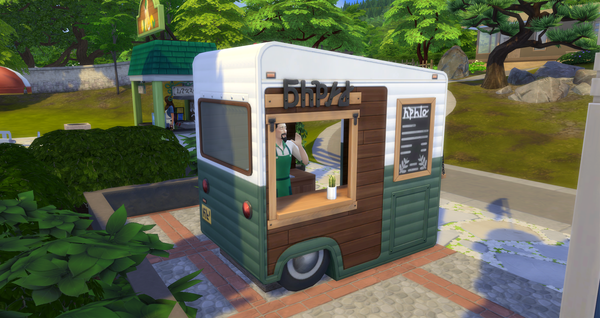 Zrobiłam też zdjęcie z rozgrywki, na którym widać Simów relaksujących się w parku, a także Sima kupującego jedzenie w stojącej w parku budce (stoisko z jedzeniem):