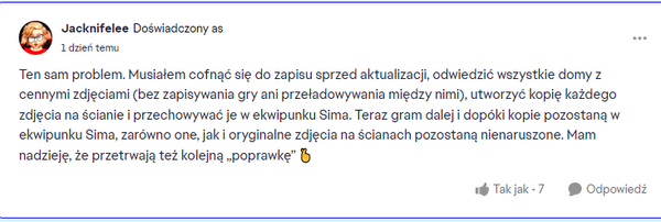 Od ostatniej aktualizacji zniknęły mi wszystkie zdjęcia z ramek we wszystkich domach. Za każdym razem jak zrobię nowe zdjęcie i wyłączę i ponownie włączę grę to wszystkie ramki po zdjęciach mają tylko czarne tło (są puste). Nigdy wcześniej nie miałam takich problemu. Bardzo proszę o pomoc 😪.