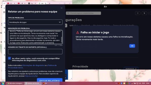 Instalei o App EA e o jogo The Sims4, mas na hora de abrir o jogo está dando erro. Já fiz a desinstalação do App EA e do Jogo The Sims4 e ao instalar novavemente e abri-los, o erro ainda continua. Fiz a limpeza das pastas e reiniciei, mas nada. Não está abrindo o jogo The Sims4, a tela carrega mas fica na cor preta e sai, mostrando uma mensagem de erro: "Falha ao iniciar jogo, um erro em nosso sistema causou uma falha na inicialização. Tente novamente mais tarde".