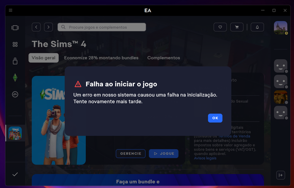 Quando eu inicio o jogo ele abre, aparece o "The Sims 4", começa a carregar na parte que o diamante fica girando e logo depois disso fecha sozinho e aparece um aviso de erro dizendo "Falha ao iniciar o jogo: um erro no nosso sistema causou uma falha na inicialização. Tente novamente mais tarde." (segue print em anexo). Isso vem acontecendo a meses e não resolve nunca, não sei mais como resolver. Se alguém teve o mesmo problema e conseguiu resolver por favor me diga o que fez!!