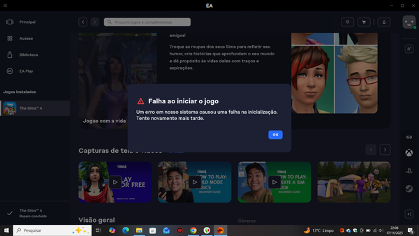 O erro “falha ao iniciar o jogo” no The Sims 4 geralmente aparece quando há arquivos corrompidos da EA App ou do próprio jogo. Recomendo tentar o seguinte: