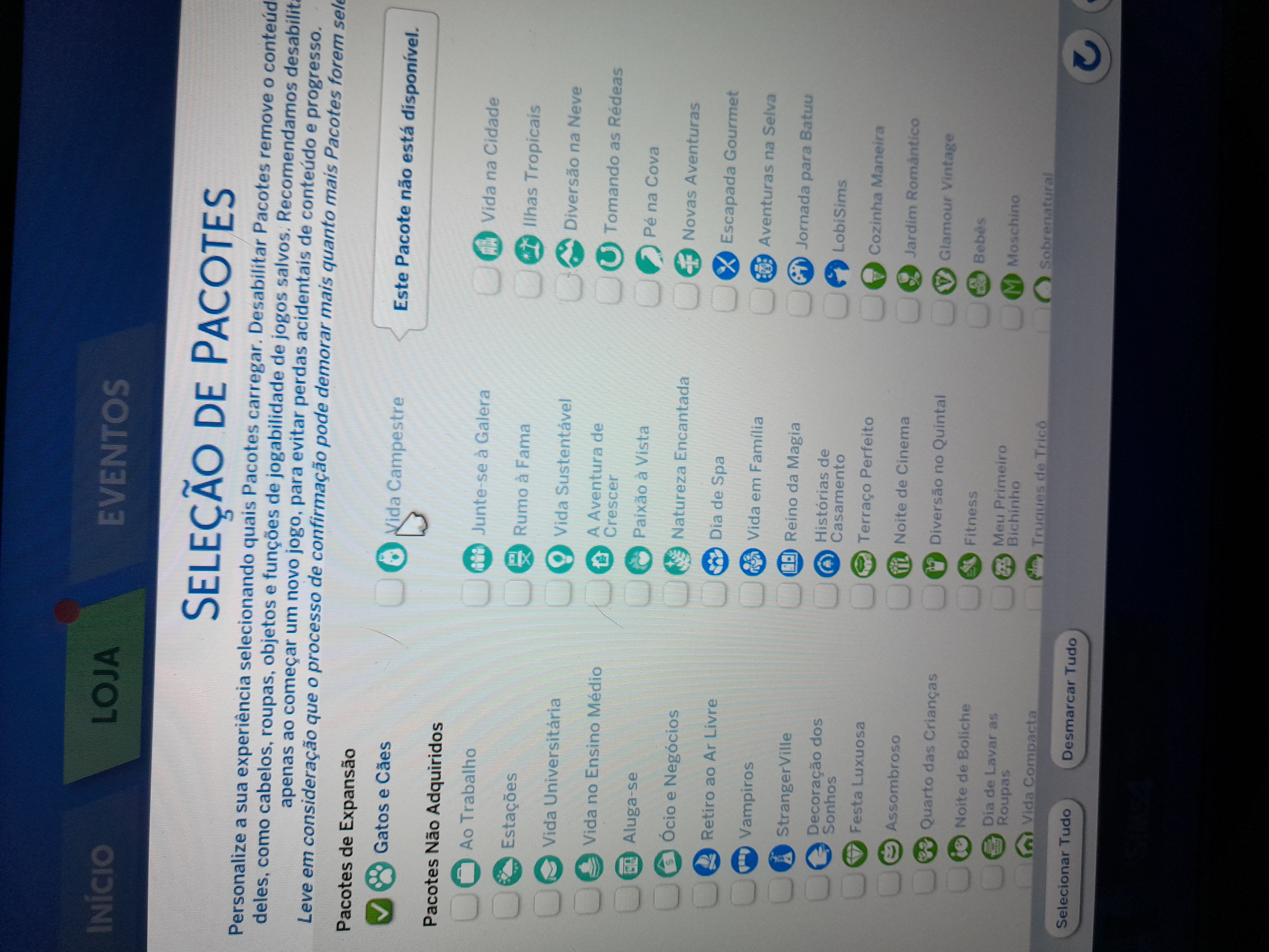Comprei o pacote de expansão "Vida campestre". Aparece que não está disponível!