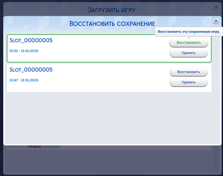 Полностью чистила диск и устанавливала чистый симс 4. Восстановила удаленные сохранения через специальные утилиты и добавила их в папку saves Не получается восстановить сохранение. После нажатия вос...