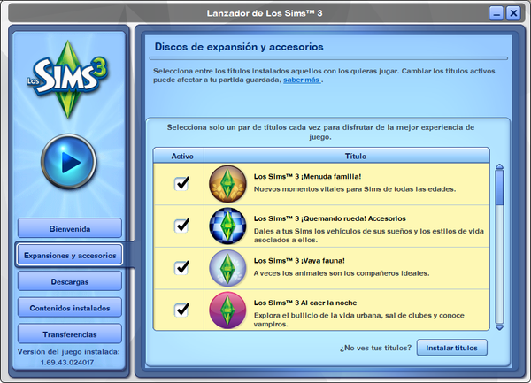 Cuando le das a jugar y se abre el lanzador de Los Sims 3, en la parte de Expansiones y accesorios puedes dejar solo activadas las expansiones con las que quieres jugar.