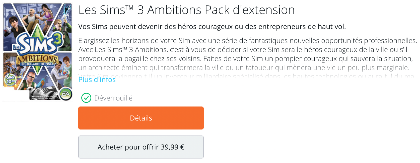 Néanmoins, ayant changé de plateforme (tjr MAC), j'ai du télécharger tous les jeux et addons en 64 bits. Le tout a très bien marché, se lance, et est jouable. Par contre, AMBITION, dans la rubrique Sims 64 bits, est annoté étant déverrouillé (voir image), mais n'est pas téléchargeable. Pourtant en 32bits il marchait et c'est clairement écrit que l'addon est déverrouillée. Est-ce que quelqu'un aurait une solution?