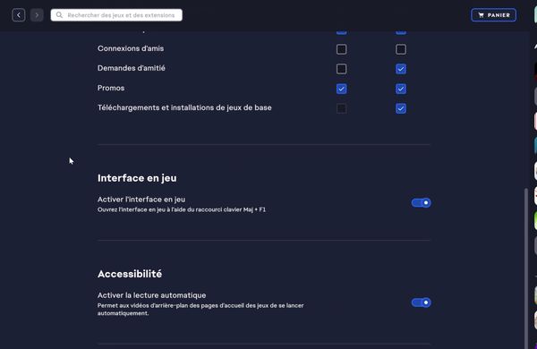 Vous pouvez bel et bien désactiver la surcouche en jeu, appelée maintenant Interface en jeu, en dessous des réglages des notifications :