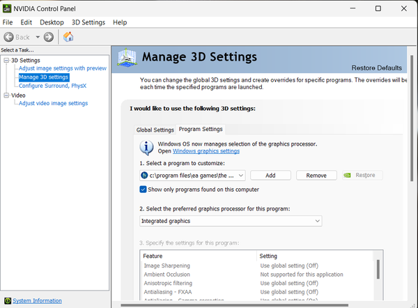 Na lewo szukacie "Zarządzaj ustawieniami 3D", zakładka ustawień programu