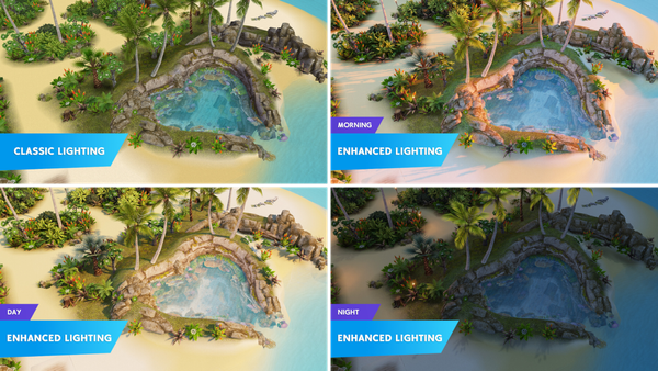 Das nächste Highlight betrifft das Licht, genießt das neue Ambiente und die zusätzliche Tiefe.. Folgende Gemeinschaftsgrundstücke wurden bearbeitet und erscheinen im neuen Licht. Gemeindezentrum, Schwimmzentrum, Schneepark, Stall, Fitnesszentrum, Campingplatz, Romantische Insel, Magischer Regenwald , die Downtown High.