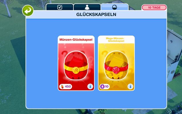 • Glückskaspel , die man alle 4 Stunden einsammeln kann, finde ich dagegen sehr hinderlich. Was lobe ich mir das Blumenbeet mit der Glücksblume, wo man verschiedene Beiträge an Simoleones bekommen konnte. Bei der Glückskapsel habe ich bis jetzt immer 500 Simoleones bis zum heutigen Tag gewonnen, egal wie oft ich eingesammelt habe…
