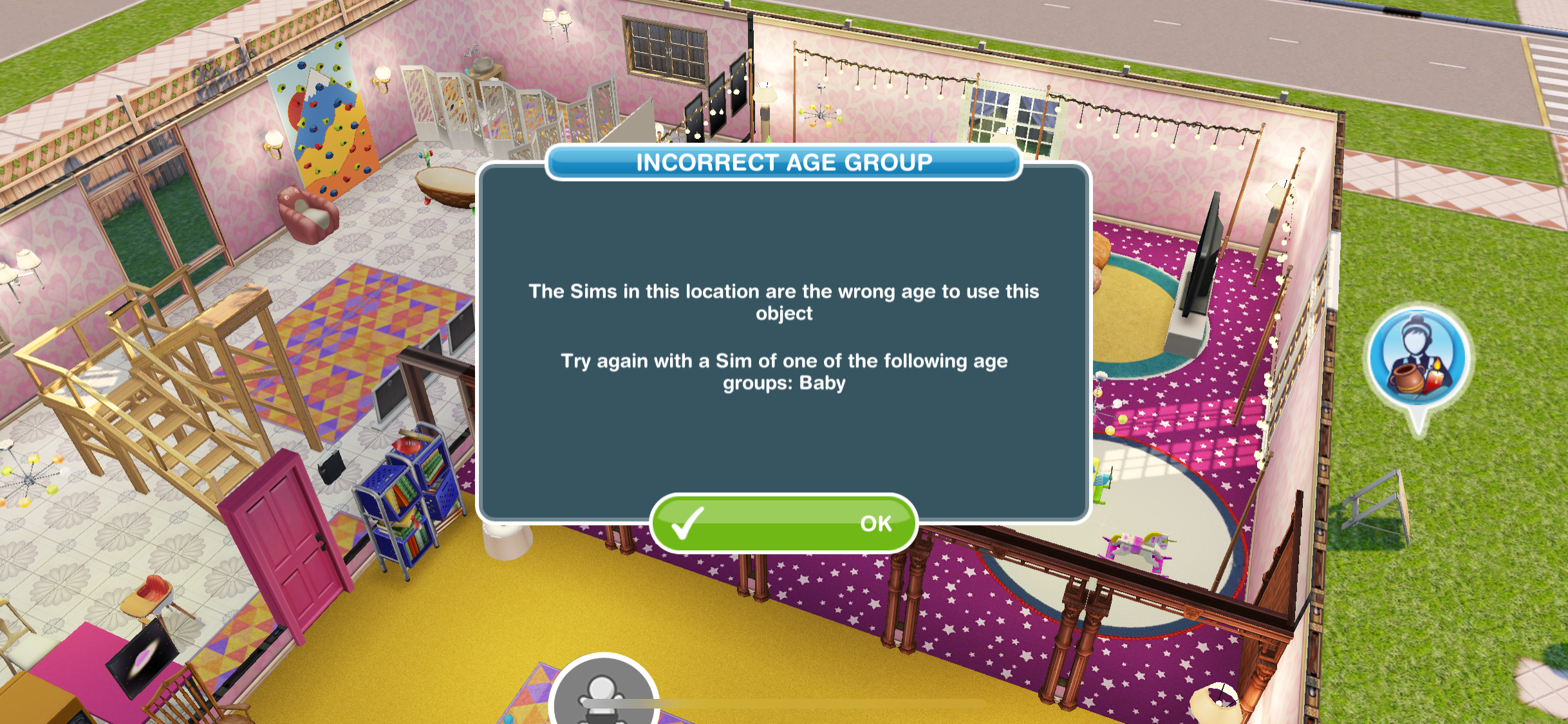 I’m sure a baby would work, but I don’t have a baby currently. Why am I getting daily tasks for something I don’t have? Probably because this daily task says “toddler” on it, which I do have. Obviously that’s a bug though, and it’s going to mess up my daily streak because I’m sure EA won’t fix this issue today.