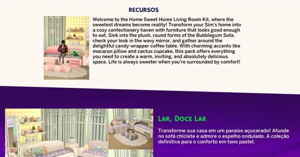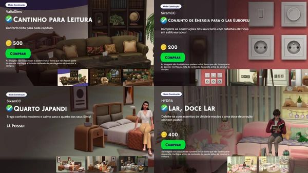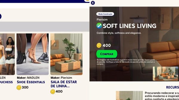 Another detail that caught my attention is that on the main page where the pack covers are displayed, there is only one pack whose name is shown correctly in my game’s language (Brazilian Portuguese). That pack is “Soft Lines Living”, from Pierisim, which appears correctly localized in Portuguese as “Sala de Estar de Linha.”