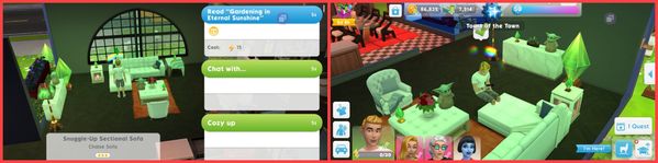 Steps: How can we find the bug ourselves? There are 2 issues: 1. Make your Sim use the Snuggle-up sectional sofa together with another Sim. This can be an action that apperars during a relationship hangout or the Chat with... option. One of the Sims will be sitting with their legs inside the sofa. 2. This sofa can't be used in Wumples quests. It bounces when I tap on it. UPDATED 28th February: Sims can use the sofa but are still sitting on air.