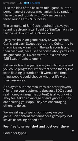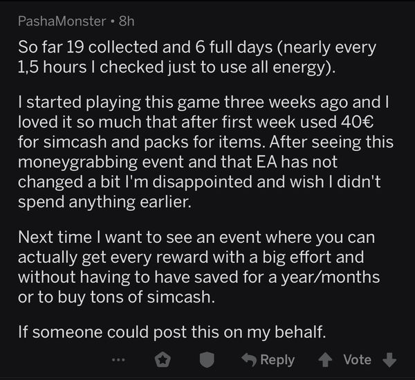 I posted a message on the Reddit TSM sub that feedback is being collected about this event, and redirected them to this thread. Some folks have come over here and posted, but not everyone has an EA AHQ account or is willing to create one. However, some folks still wish to be heard, so I volunteered to relay feedback if they specifically made that request in their comment. I hope this is okay.