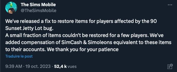 D'après le compte X du jeu, une mise à jour pour restaurer la progression a été mise en ligne hier. Une petite partie des objets n'a pas pu être récupérée auquel cas une compensation en simcash a été faite.