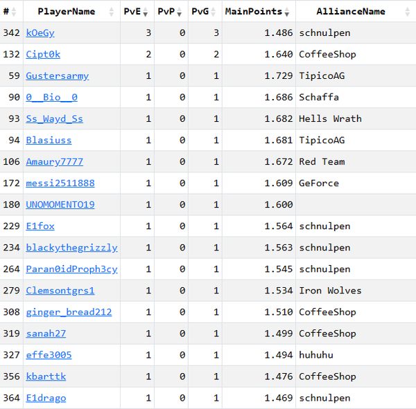 Die PvE-Basher sind über alle Allianzen verteilt. Ich muss zugeben, ich hätte gedacht Schaffa und die eisernen Wölfe wären präsenter^^: