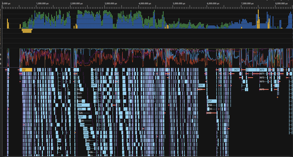 You can see massive idle times in the gpu events. There are no barriers there, pure gpu idle waiting for tasks. What's concerning that there's still some idle time even in the "unaffected" frame.