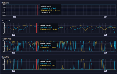 Racenet telemetry graphs show a distance marker in meters if you mouse over any point to compare, as so: