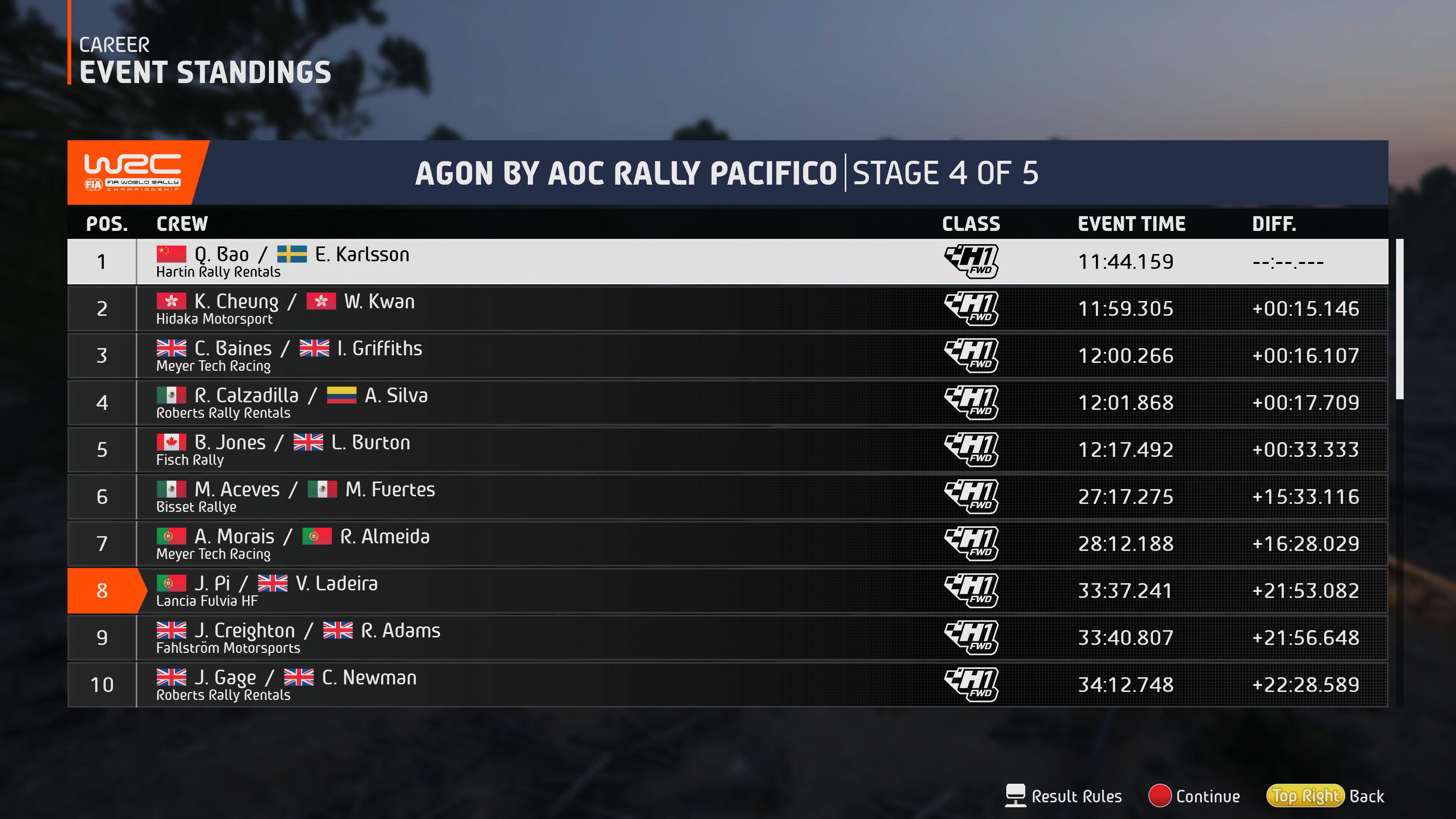- @EA_Groguet It happens in quick play/custom championship too. I've created a 3 stage rally, finished 1/2/1 and ended 13th overall, 9 minutes off the winner who looks like they have run only 1 stage out of the 3.