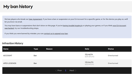 I need help resolving an issue with my Apex Legends account. My account was falsely banned, but after appealing, the ban was overturned. However, when I log into the game, I get kicked from the lobby...