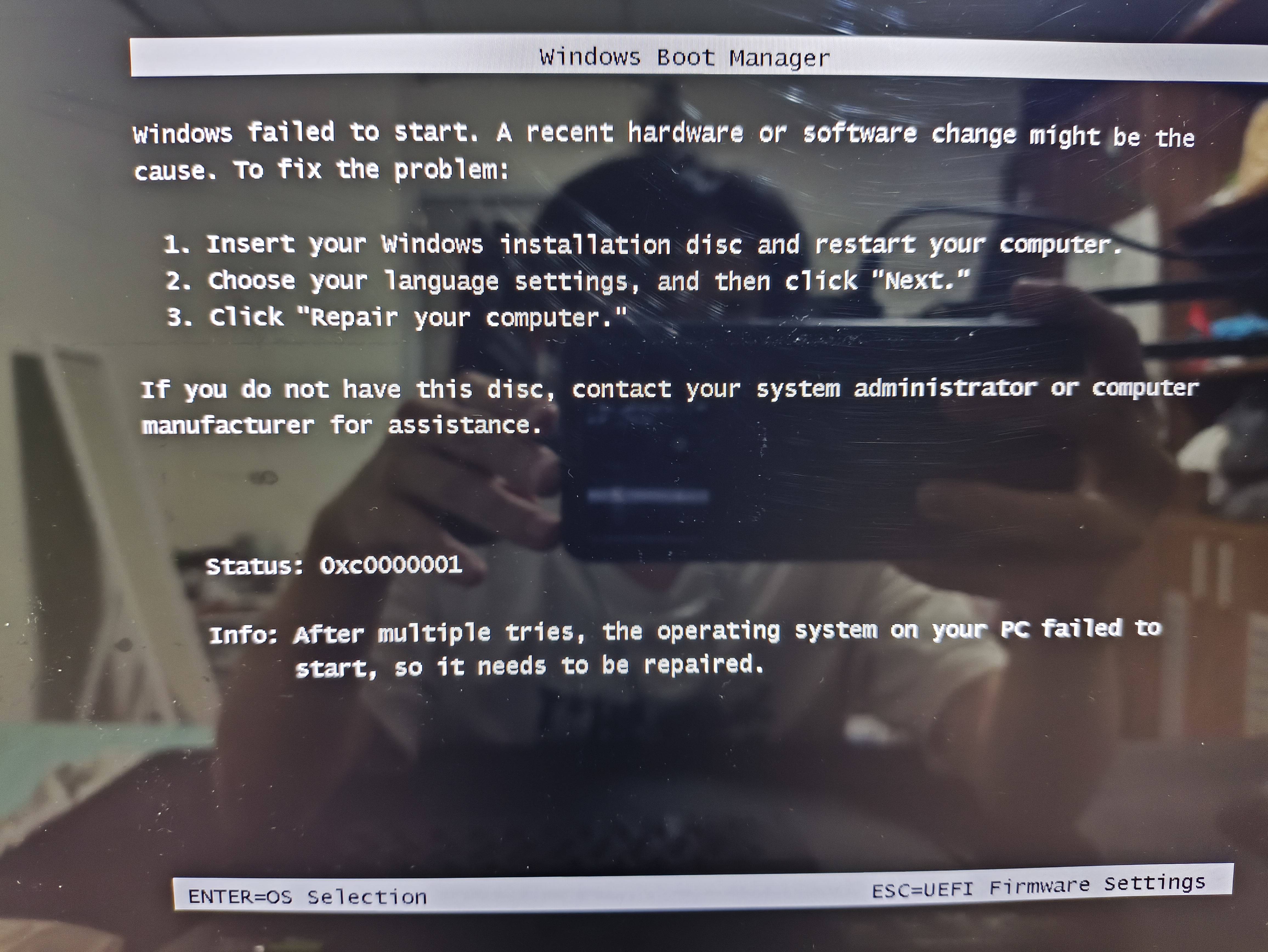 - Error Codes: Initially, the system would boot into Windows Boot Manager with the error code 0xC0000001. Later, it would also trigger a repair mode with the same error code.