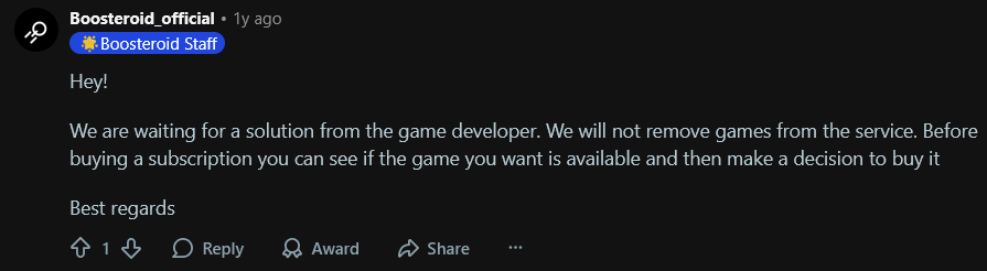 I am writing this bug report after realizing that no one is aware of this or does not want to talk about this. This is not a direct bug report regarding the in game performance or stability issues but rather the availability of the game itself. It is no doubt that the times and the ways we game, the prices we pay for games and the way we own or have access to those games are changing. Naturally, Cloud Gaming presents itself in this predicament as an alternative solution to ever so evolving, ever so competitive market where access to hardware becomes less likely than yesteryear. One such platform is Boosteroid. One of many competitors to widely known brands like Xbox Cloud Gaming or Nvidia GeForce Now.