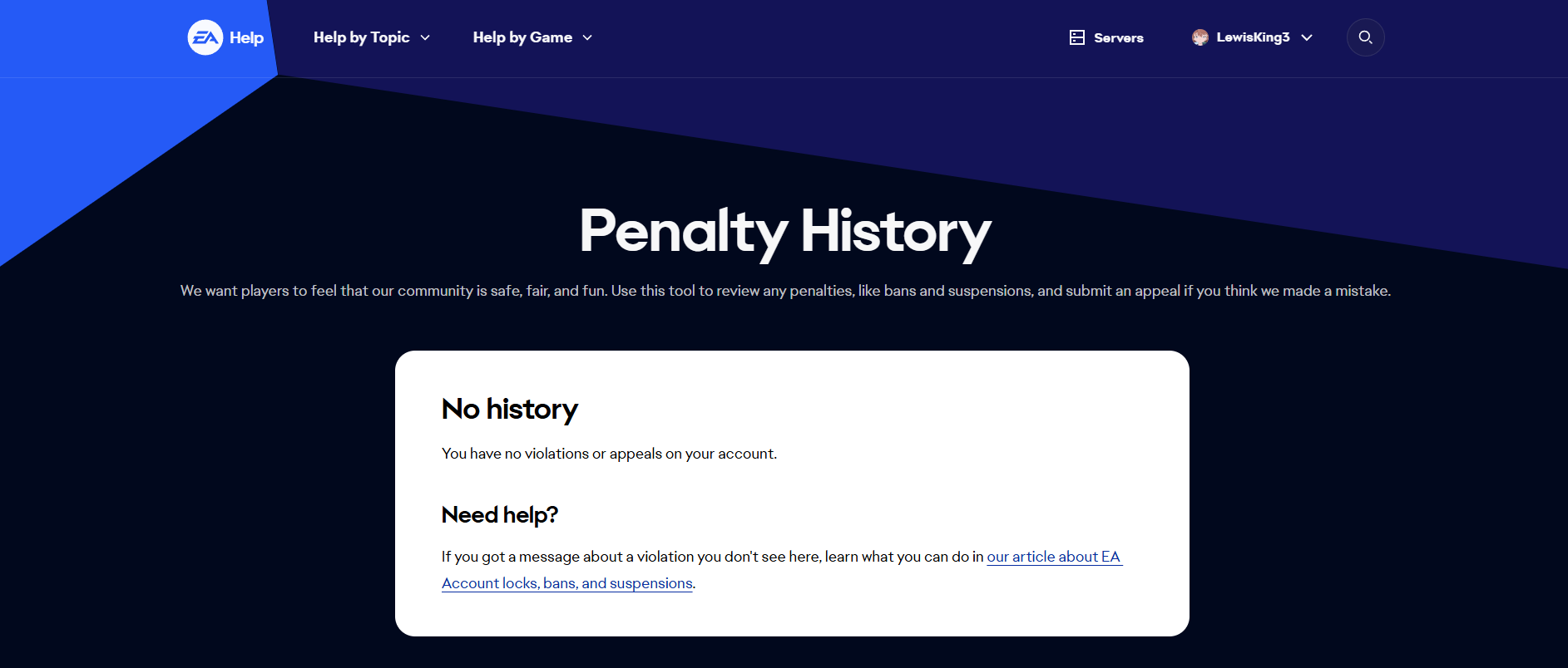 Just to check, did you play via the EA app or a different platform? If it was a different platform (like Steam, Xbox, etc.) could you quickly try logging in here with the same EA account you're checking the ban history on to see if the affected account is linked?