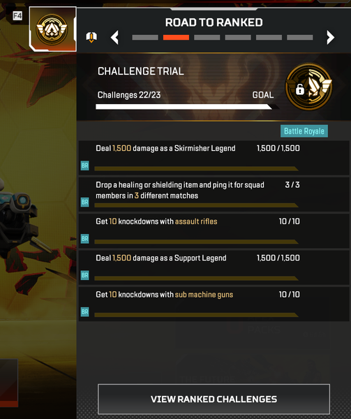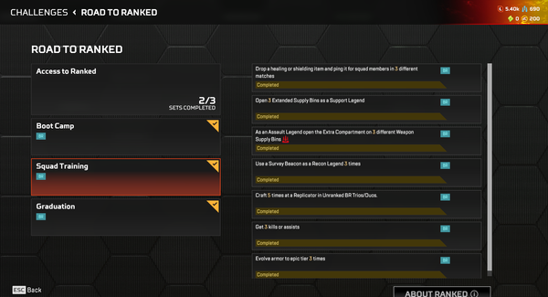 Hello, I've completed ALL 23 Road to Ranked challenges (Bootcamp, Squad Training, and Graduation) in standard BR pubs only. Account level >20. - Progress shows 22/23 or 2/3 sets complete, but EVERY challenge is marked done. - I think it's a known bug.