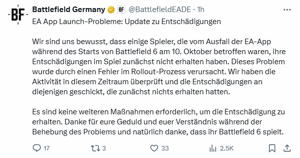 EA hat am WE bekanntgegeben, dass alle, die am Freitag bis in die Nacht hinein nicht spielen konnten, weil die EA App gesponnen hat, eine Entschädigung bekommen, die im Laufe des Wochenendes mittels Ingame Nachricht verteilt wird.