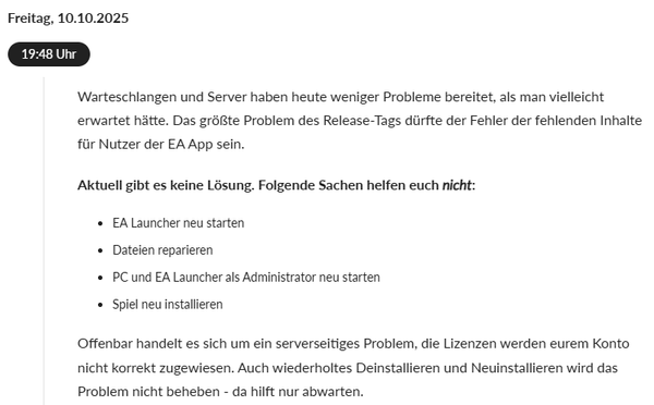 gestern kam es zu einem Ausfall der EA-App, der einigen Spielern, die Battlefield 6 vorbestellt hatten, den Zugriff auf das Spiel verwehrte. Wir wissen, dass das frustrierend sein kann, deshalb möchten wir uns entschuldigen … mit Extras.
