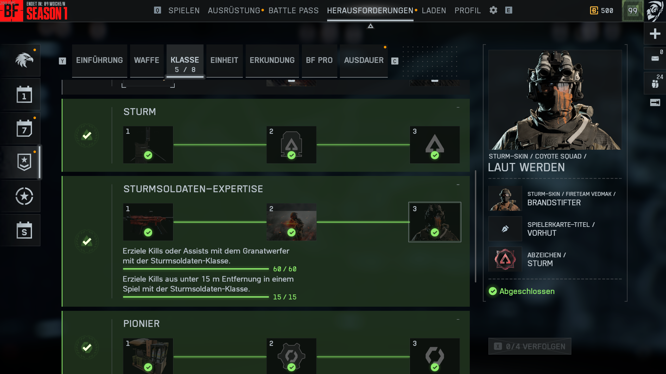 Ich habe alle 6 Missionen der Sturmklasse durchgespielt, jedoch bekomme ich nicht das letzte Klassenabzeichen.. Ich kann den Titel auswählen aber das icon bleibt bei Platin in der Klassenauswahl bei den Waffen.. Habe das Spiel schon einmal neuinstalliert, bringt leider nichts..